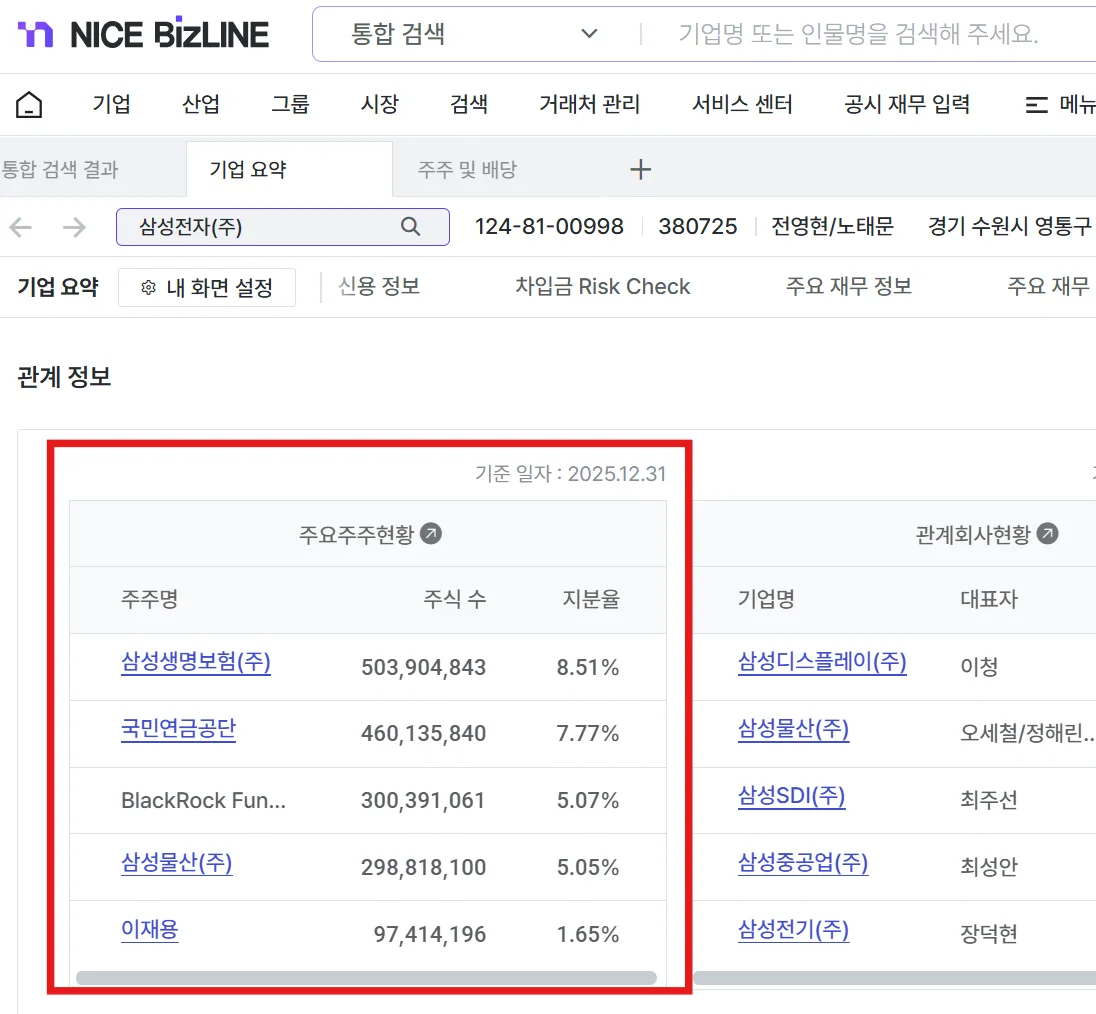 활용: NICEBizLINE 등을 통해 주요 주주 및 상세 내역을 한눈에 확인할 수 있습니다.