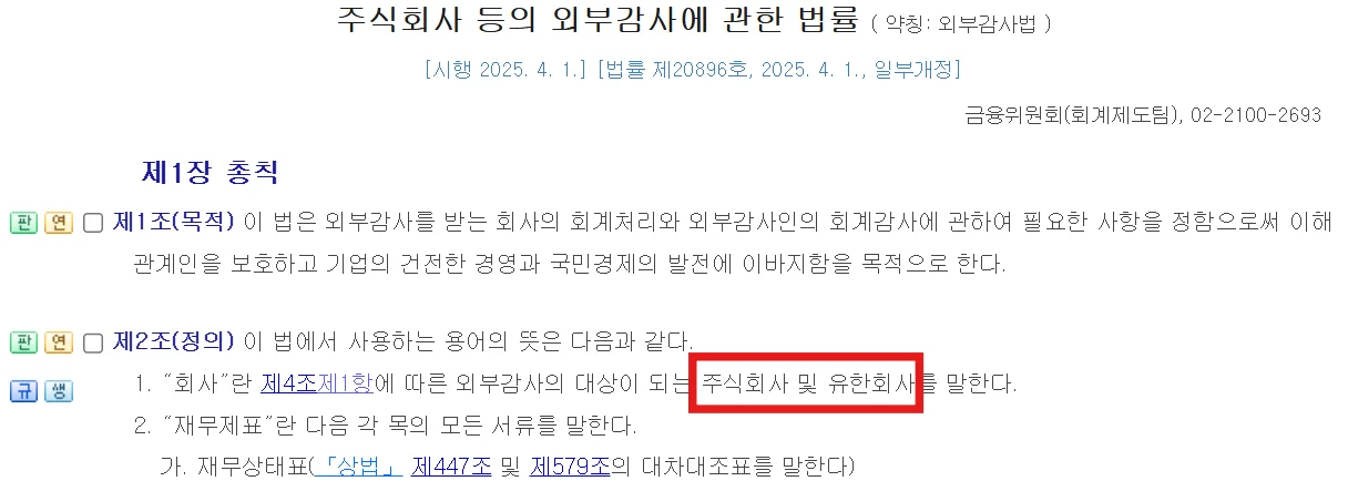 과거에는 외부감사를 받지 않았으나, 2017년 외부감사법 개정으로 일정 요건을 충족하는 유한회사도 반드시 외부감사를 받아야 합니다.주식회사 등의 외부감사에 관한 법률 예시: 구글코리아, 넷플릭스코리아, 애플코리아 등 대부분의 외국계 기업 현지법인