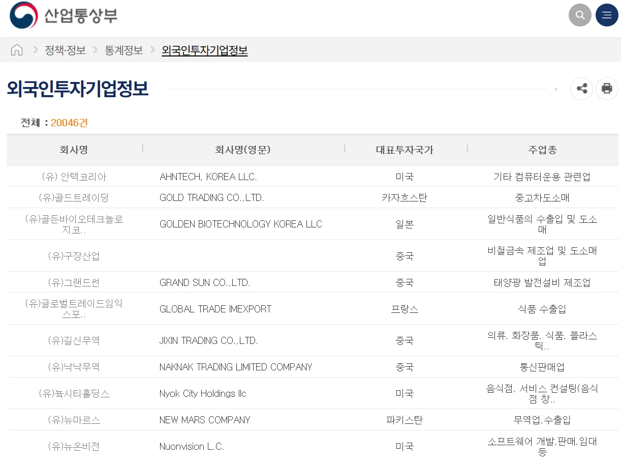 출처: 산업통상부 홈페이지(외국인투자기업정보)