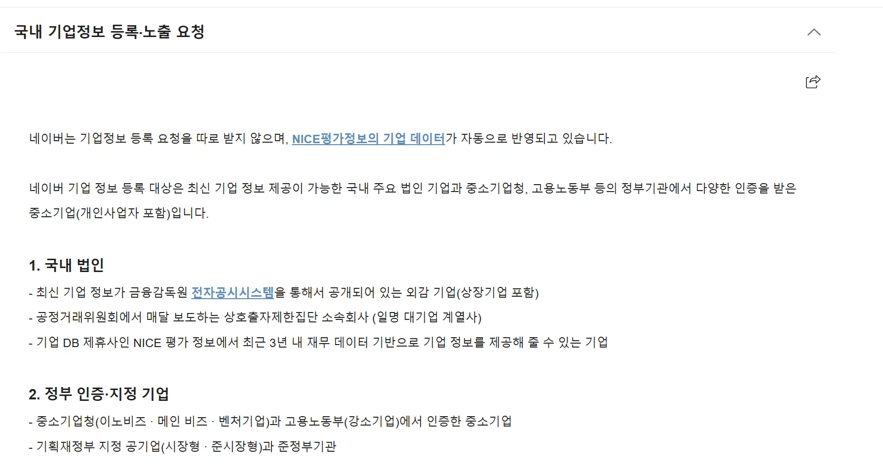 정리하자면, NICE평가정보에 기업정보가 등록되어 있어야 네이버 기업정보 프로필에도 노출이 될 수 있습니다.