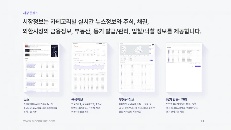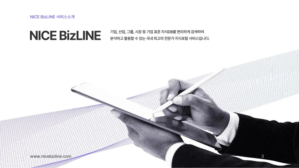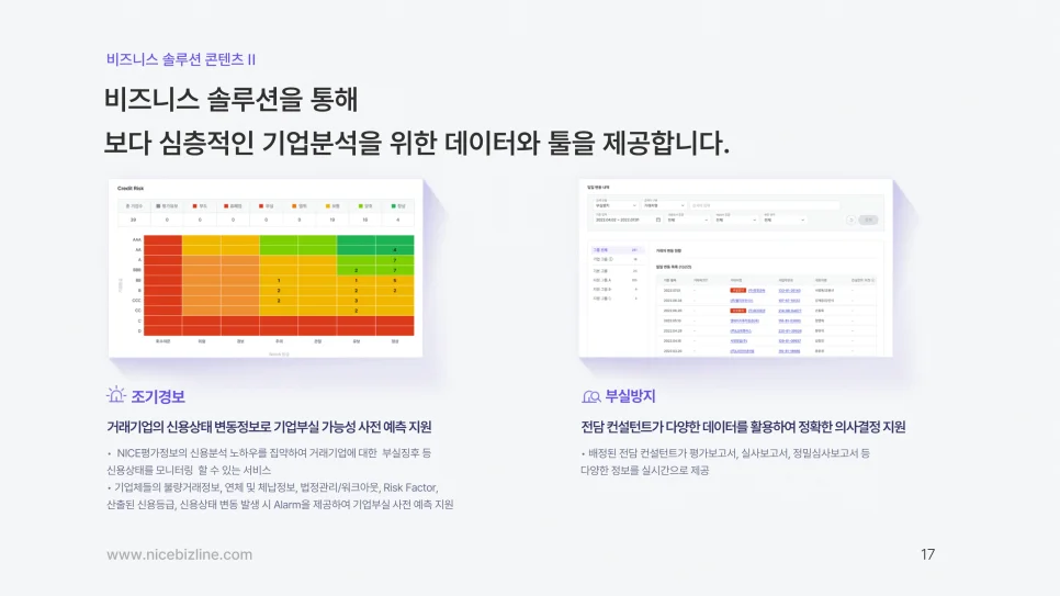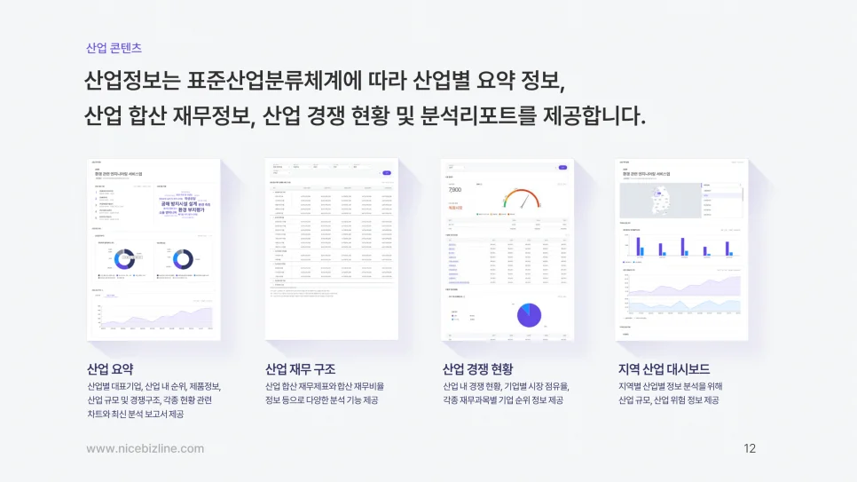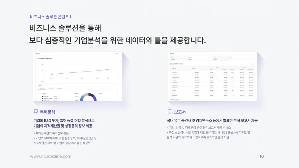NICE BizLINE에서는 기업의 재무정보, 신용정보, 산업동향, 시장 데이터, 트렌드 콘텐츠, 현금흐름까지 기업 경영에 필요한 다양한 정보를 제공합니다.