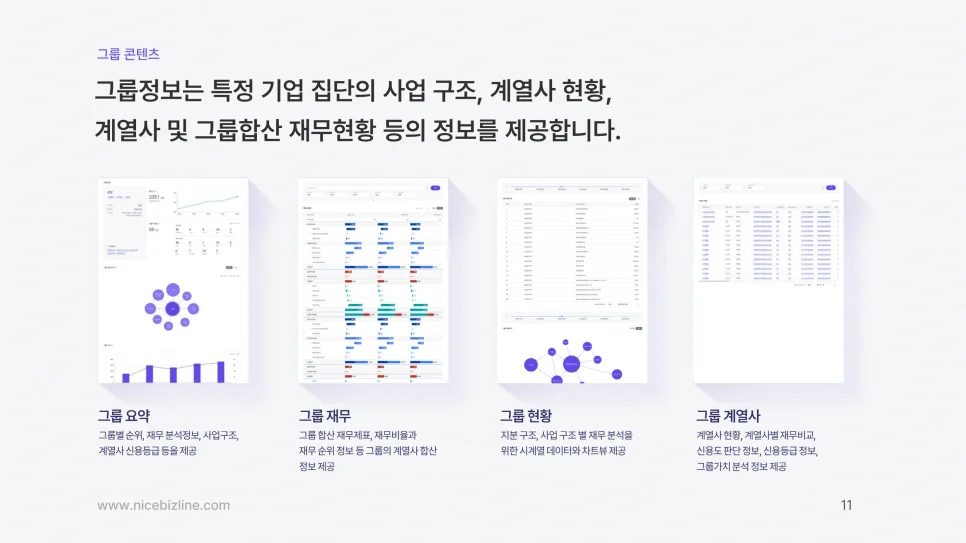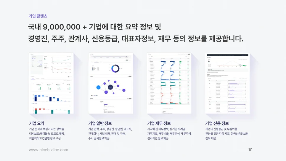나이스비즈라인은 최대 약 900만개의 기업에 대한 요약 정보 및 경영진, 주주, 관계사, 신용등급, 대표자정보, 재무 등의 정보를 제공합니다.
