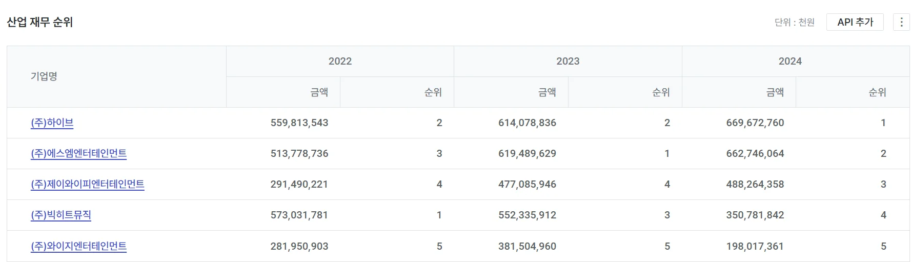 지난 3년간 엔터업계에서의 매출액 순위 변동을 볼 수 있습니다.