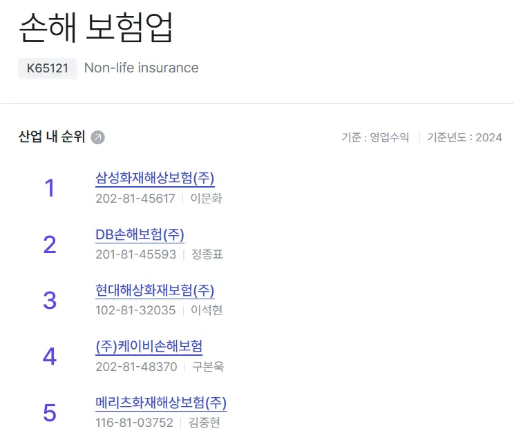 기타 및 외국계 (28%): 국내사가 전체 원수보험료의 약 98%를 점유하고 있으며, 외국계는 약 2% 수준으로 일반보험 및 재보험 시장에 집중하고 있습니다.